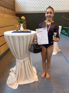 Chiara hatte sich dagegen nach langer Verletzungspause Anfang des Jahres langsam wieder herangekämpft und wollte zeigen, dass sie bis zu den Deutschen Jugendmeisterschaften wieder da ist. Das gelang ihr und sie wurde dafür mit einem 9. Platz belohnt. Sie turnte sicher, solide und gekonnt durch. 41,05 Punkte standen am Ende auf Ihrem Konto. Unter den Umständen und mit Trainingsrückstand eine echt starke Leistung.